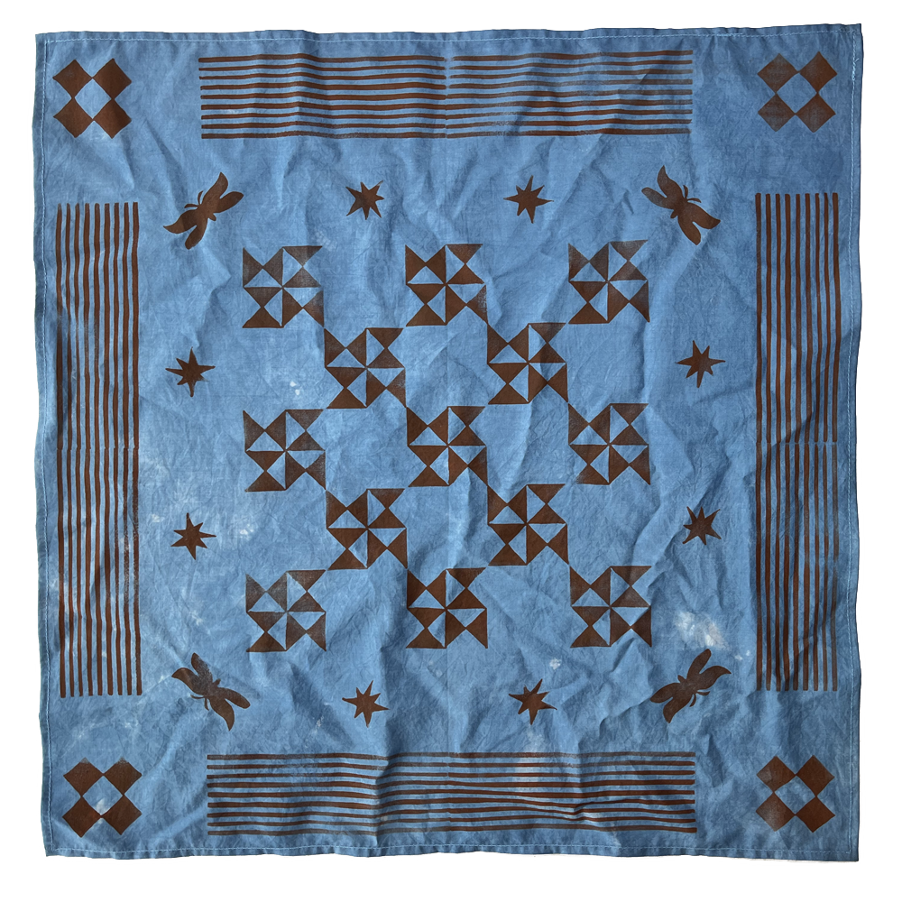 GOTS-certified organic cotton bandana naturally dyed with indigo. Block-printed in brown ink.